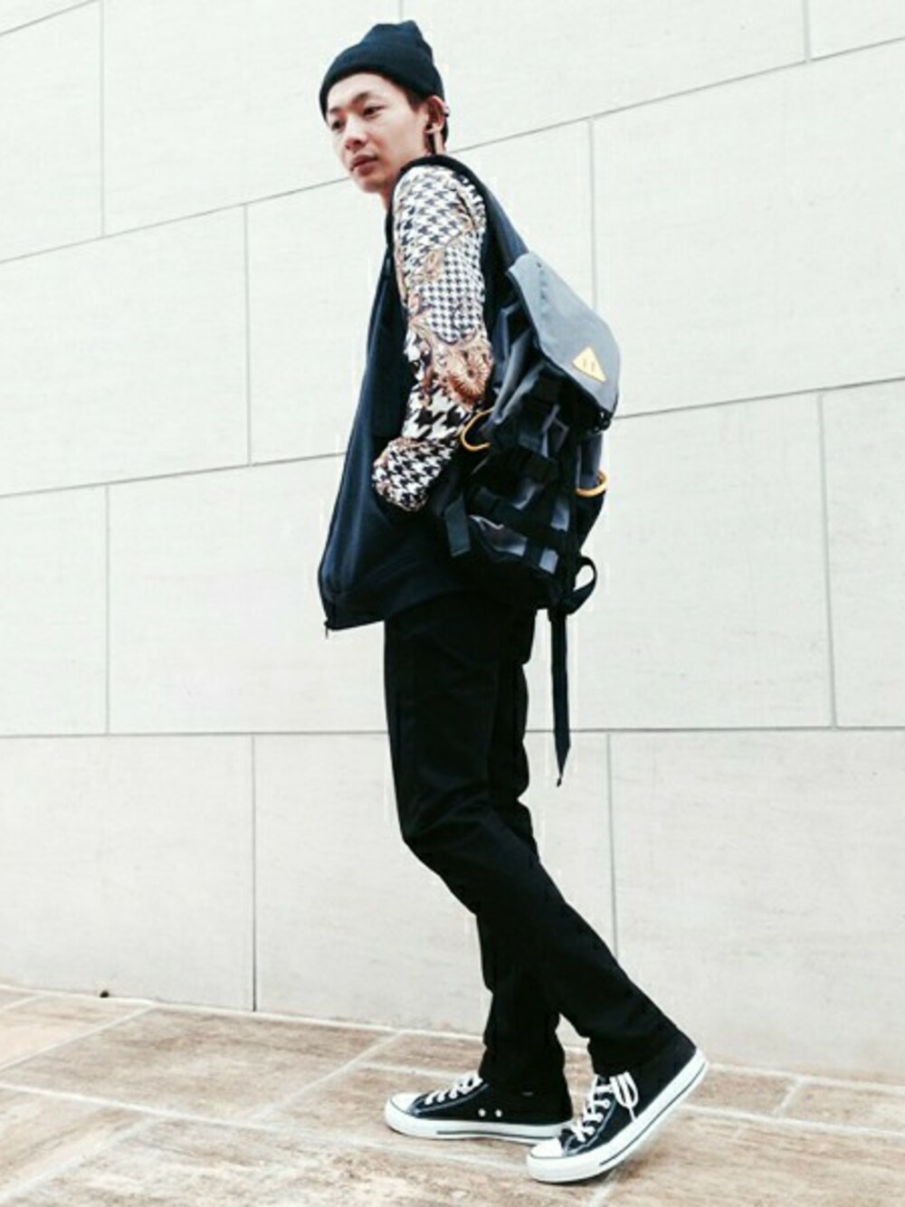 バロック柄スリーブのスウェットブルゾンが新しい ブラック系統でまとめると荘厳なデザインが際立つ