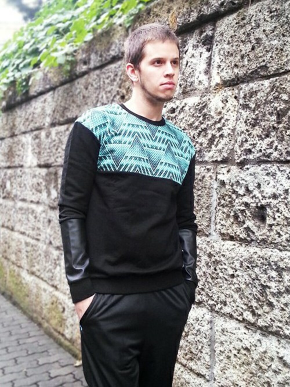 TOPMAN プロモーション クレイのスウェット「TAXONOMY / PYRAMID PRINT FAUX LEATHER SWEATSHIRT」を使ったコーディネート