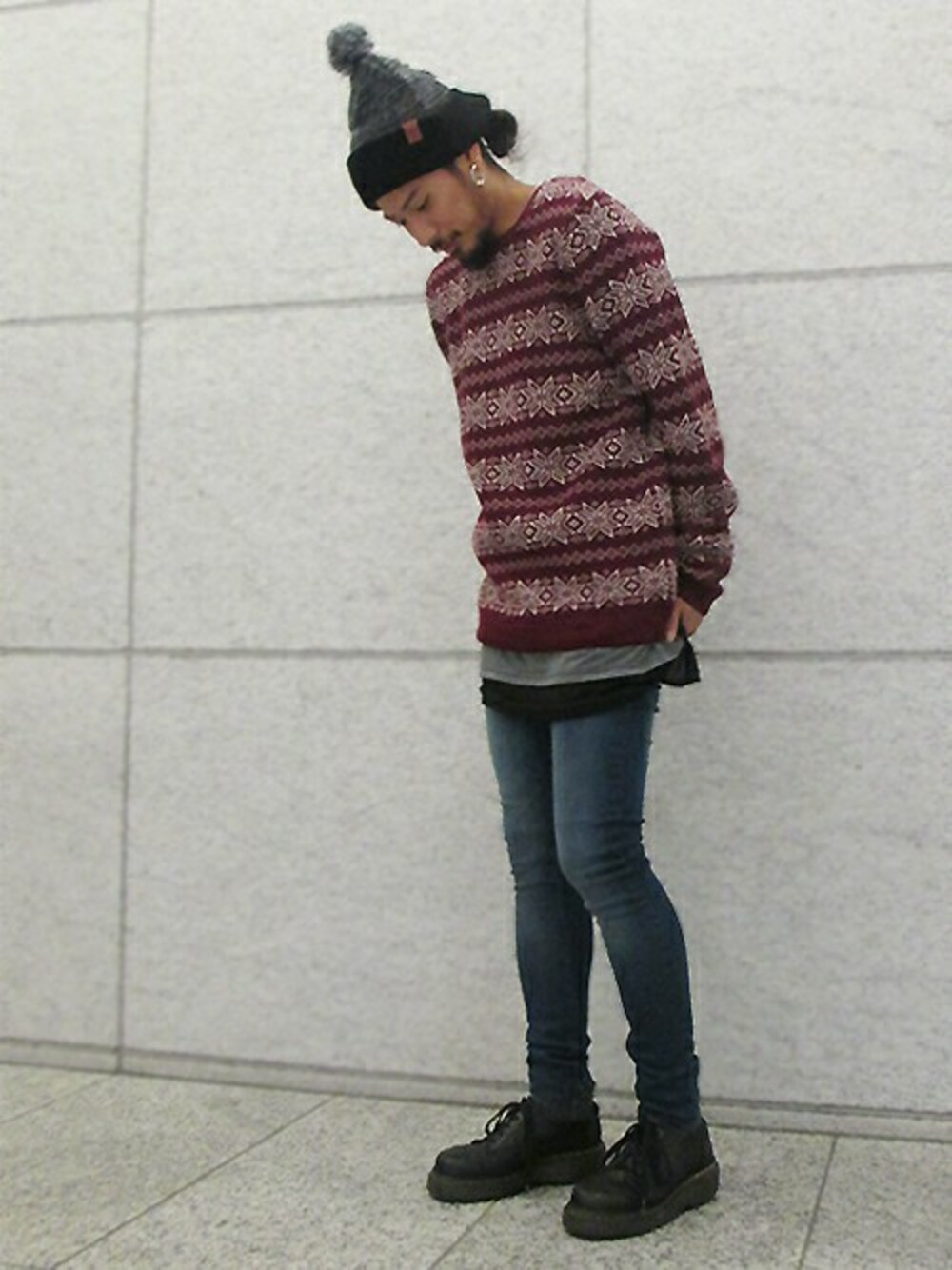 かじのニット/セーター「BURGUNDY SNOWFLAKE JUMPER/バーガンディ スノーフレーク ジャンパー」を使ったコーディネート