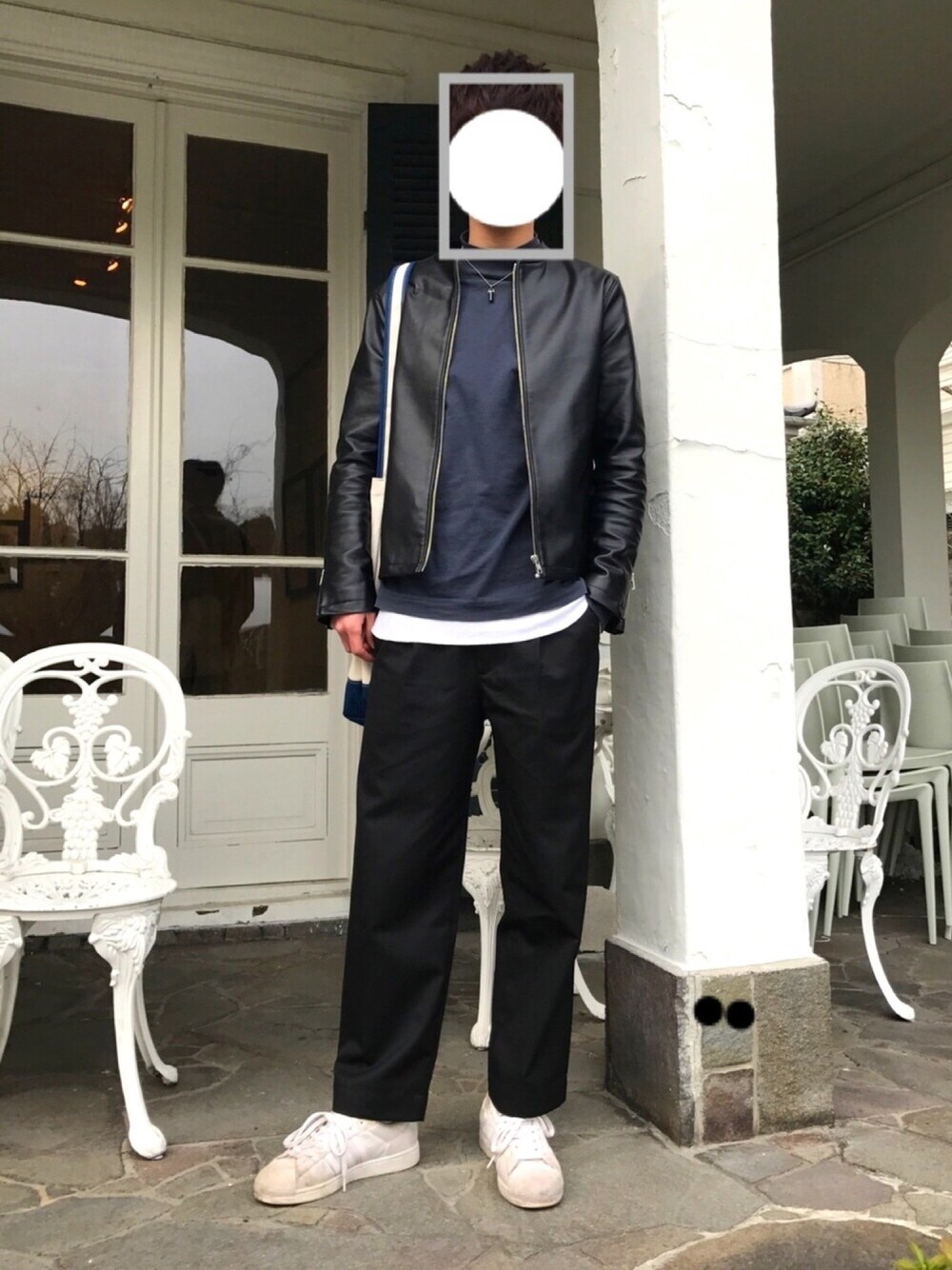 モノトーン+1色で揃えたライダースコーデ✨ スラックスワイドパンツを使ってAシルエットを心がけ、白スニーカーで足元を軽くしたコーデ✨ もしよければ、いいね・セーブ・フォロー宜しくお願いします😊