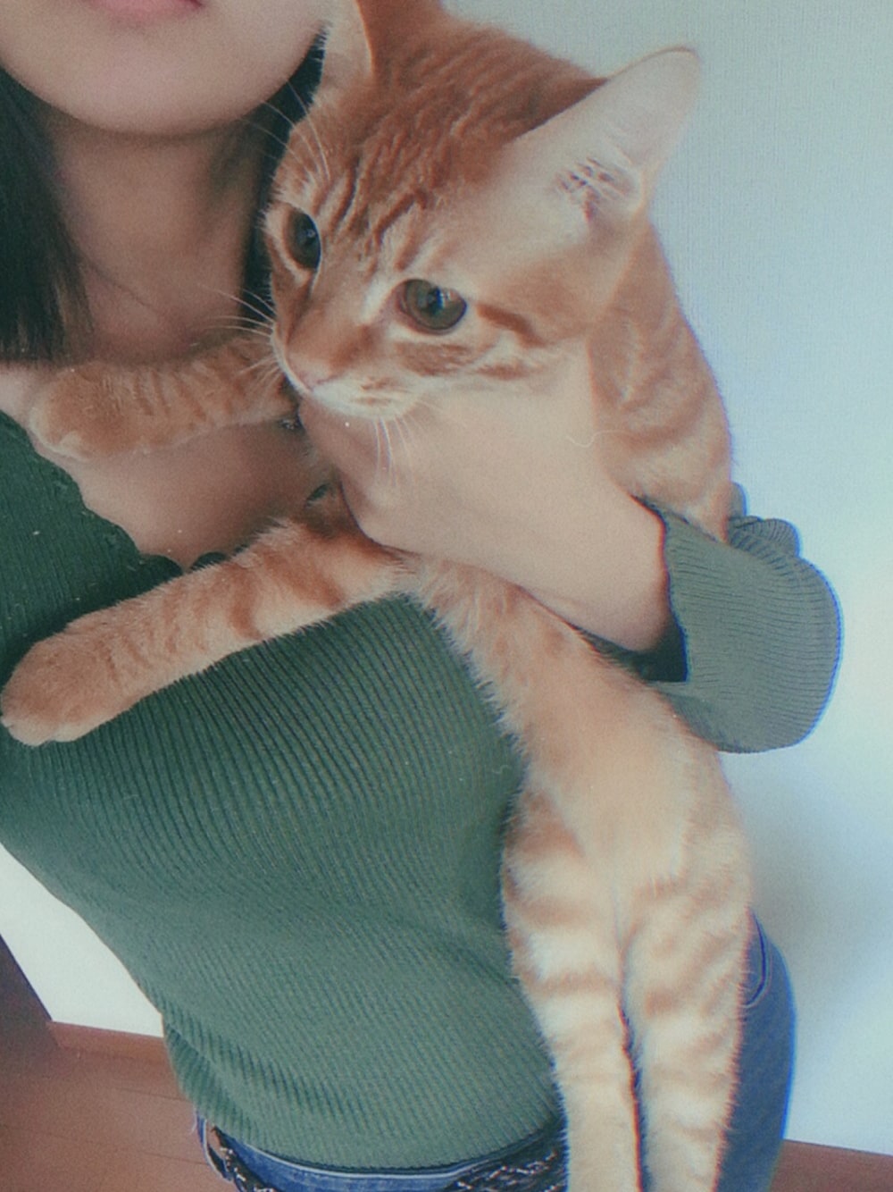 実は緑のも持ってます🙂 どー合わせたらいいか分からなくてとりあえず色が好きで単体で着ようと思って買いました🙂 首元が可愛いと思うんだっ 猫の名前は「ろい」です 生後1週間くらいで拾ってそれから哺乳瓶で育てました。4月生まれなのでもう6ヶ月くらい経ちました🙂