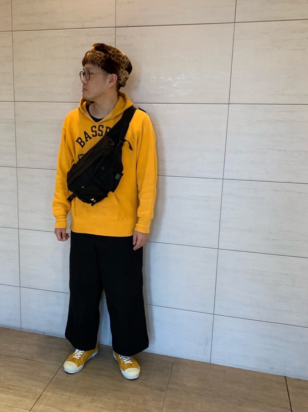 70s 単色タグ チャンピオン RW パーカー イエローコーデ レオパードファーロールキャップはフリークス