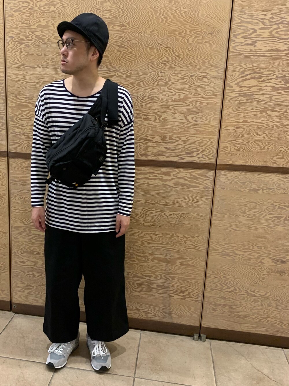 H&M ボーダーカットソー ボーダーコーデ ウエストポーチをポイントに。