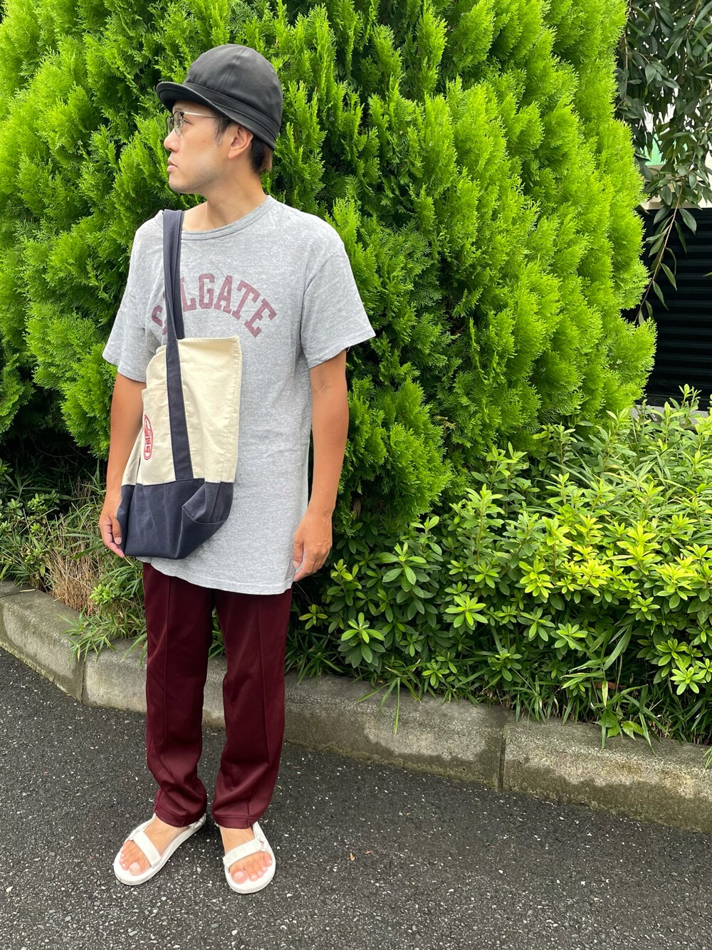 80s チャンピオン 染み込みプリントT エコバッグはTrader Joe's トラックパンツはVarde77