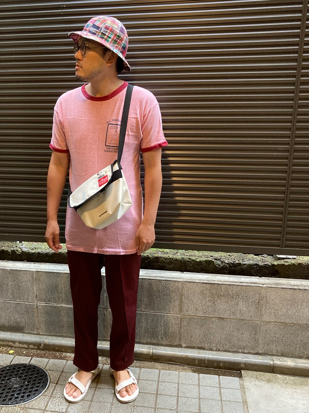 70s チャンピオン ウイングフットプリントT 霜降りピンクのワンツーボディ ピンクコーデ