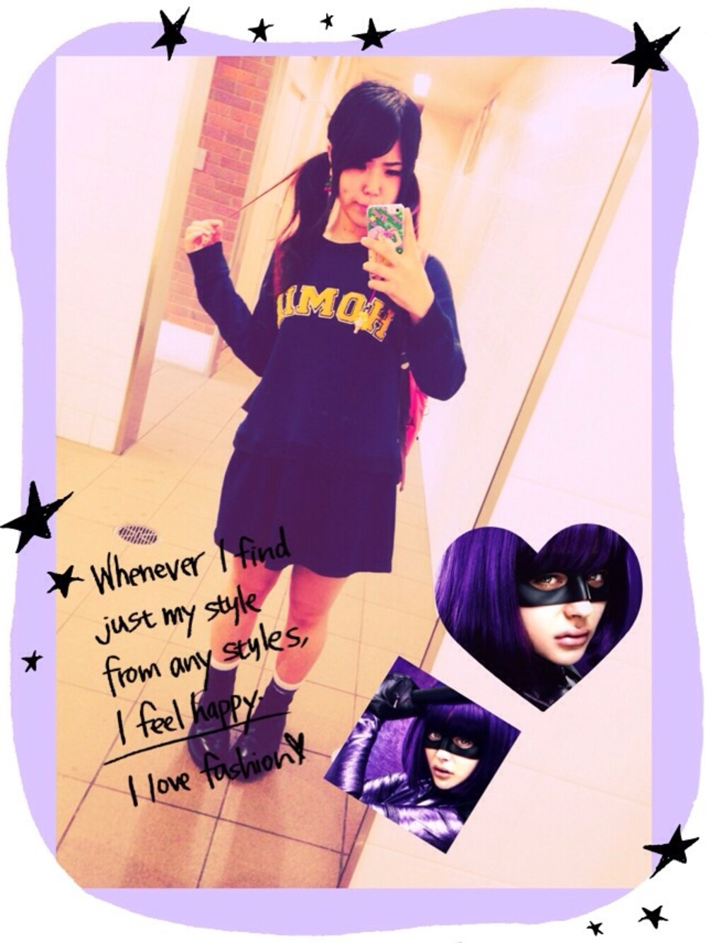 紺色のワンピースです(⌒▽⌒) 靴下は紫とからし色のラインの入ったスポーツソックスです(⌒▽⌒) iPhoneケースがマミです(⌒▽⌒)笑