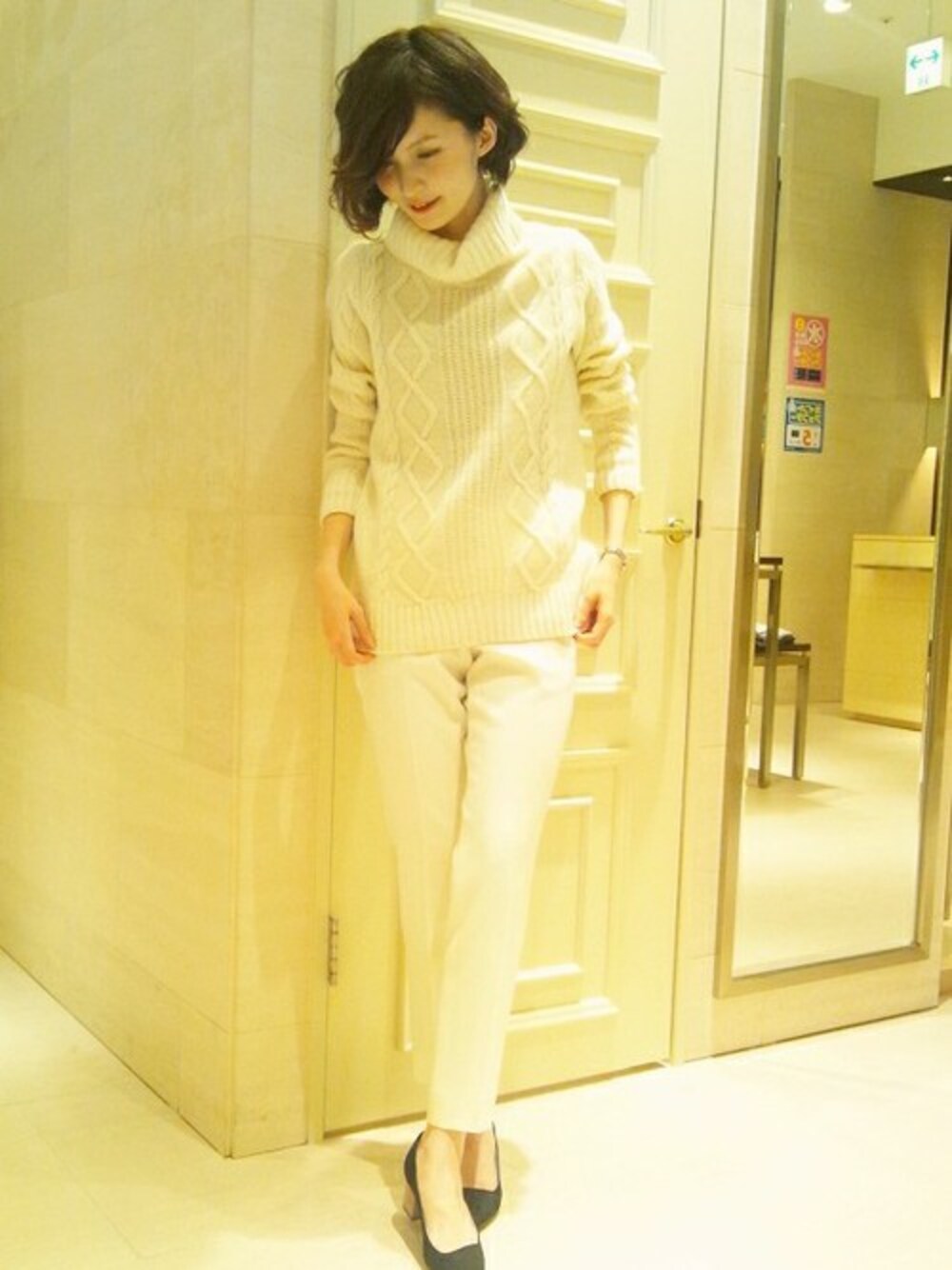 全身ホワイトコーデです♪ ゆったりオフタートル&ミドルゲージのトップスを選んだら、 同じホワイトでもセンタープレスの細身のパンツを合わせて膨張感を消しましょ(。-∀-) 都内雪降ったみたいですねー! 皆さん風邪引かないよう暖かいファッションで この冬乗り切りましょうね。。。