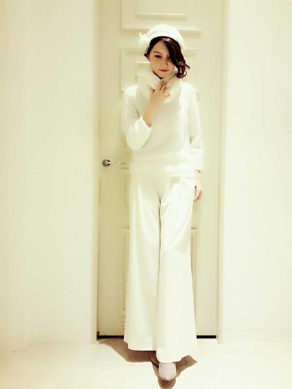 全身白コーデです(゜ロ゜)♥ 寒くなってくると明るいカラーでワントーンコーデにチャレンジしたくなります。 同じ白でもちょっとずつ素材を変えるのがコツです。 特にモヘヤは毛が飛ぶので、アウターやボトムにくっつかないような素材を選ぶことが大事です。 静電気防止剤を使うのも手ですね(*^^*) 有名なのはエレ○ード…
