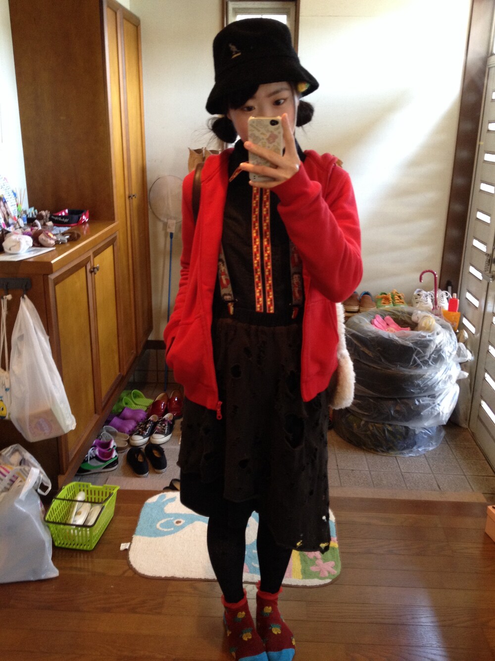 トップス…マークジェイコブス 帽子…カンゴール 靴下…used スカート…ブランド不明 サスペンダー…used 柚子のピン…リメイク 鞄…used