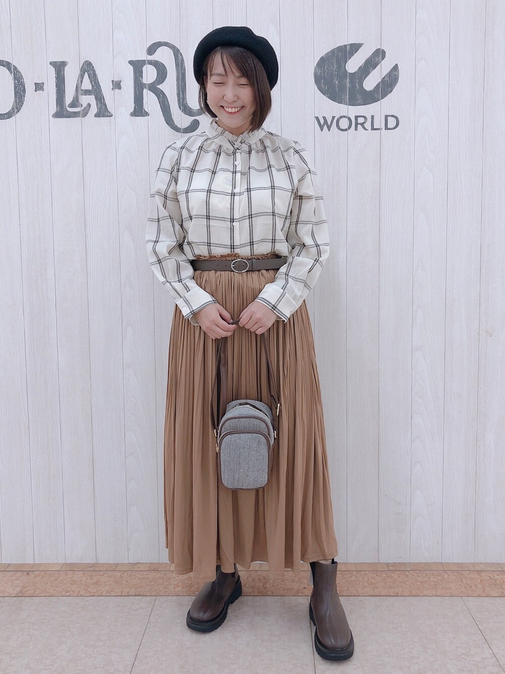 ⭐︎藤本美貴さん着用⭐︎チェックのブラウスにキャメルやブラウン等を合わせて秋色コーデ♪ ブラウスは首元にちょこっと付いたフリルがさりげなくかわいい♪お家でお洗濯出来てシワになりにくい優れ物です! スカートは丈が短めなので、ブーツと合わせやすいのが嬉しい♪ もうすっかり秋ですね …でもなんかジメジメして蒸し暑いような… 先日台所になめこの切り株(?)を放置していたら、なんかわたあめみたいな菌糸が大量発生していました… とりあえず熱湯かけてまた放置しました… さて、シューラルーでは秋の新作商品続々と入荷しております!! これからアウターやニット類もどんどん増えてきますよ〜〜 オンラインストアでは予約も出来ちゃうので、是非チェックしてみてくださいね(^∇^)