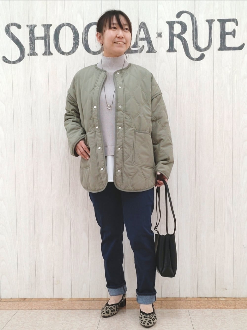 ✾ゆるシルエットのジャケットで春のデイリーカジュアルコーデ✾ 【サイズ感】 ジャケットは大きめの作りでゆるっとしたシルエットなので、中にニットを着ていてもMサイズで楽に羽織ることが出来ました♪ ニットはラグランスリーブなので、肩幅がある私でもMサイズでちょうど良かったです! デニムパンツはストレッチが効いていますが、ウエストゴムではないので私はLサイズでちょうど良かったです! 【素材感・着心地】 ジャケットはつるんとした光沢感のあるポリエステル生地で、嬉しい撥水加工付きです♪あったかいのに軽くて楽ちんなので、アウトドアや公園遊びにもオススメですよ(*^^*) ニットは柔らかいレーヨン混の素材で着心地抜群!ハイネックですが肌が弱い私でもチクチクせずに快適に着ることが出来ました♪ デニムパンツは綿ベースですが伸縮性のあるデニム生地で、動きやすくとっても楽ちん!洗濯機で洗えるのでお手入れも簡単ですよ(*^^*) 【オススメポイント】 ジャケットはシンプルな丸首なので、インに着る服のデザインを選ばずとっても着回ししやすいです!丈も長過ぎないのでデニム合わせの王道カジュアルコーデはもちろん、花柄のスカートなどガーリーなアイテムと合わせてミックスコーデにしてもオシャレにキマりますよ♪ ニットは1枚でレイヤードスタイル風になる優秀アイテム!シンプルなデニムとのコーデもこなれた印象になります♪ デニムパンツは定番のスキニーシルエットですが、ピタッとし過ぎず伸縮性もあるのでとっても動きやすい!よく歩くお出かけやアウトドアにもオススメですよ(*^^*) 【スタイリングポイント】 カジュアルなキルティングジャケット✕デニムのデイリーカジュアルコーデですが、インにレイヤード風のニットを合わせてこなれ感のあるオトナカジュアルコーデにしてみました♪ ベーシックカラーでまとめるとより大人の落ち着いた雰囲気になりますよ(*^^*) ※ピアスはスタッフ私物です