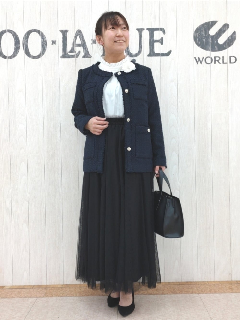 ✾ツイードのジャケットで華やかなフォーマルスタイル✾ 【サイズ感】 ジャケットはストンとしたシルエットで少しゆったりめの作りなので、肩幅が広くバストが厚い私でもMサイズでちょうど良かったです! スカートはウエスト総ゴムなので、普段Lサイズのボトムを穿いている私でもちょうど良いサイズ感でした♪ 【素材感・着心地】 ジャケットはポリエステルベースの柔らかめのツイード生地で、見た目よりも軽く楽に羽織っていただけます♪裏地が付いているので滑りもよく着脱もしやすいですよ(*^^*) スカートはリサイクルポリエステルを使用しており、環境に優しい一品♪チュールの下に裏地もついているので肌着が透けにくく、陰影でニュアンスのある表情になります♪ 【オススメポイント】 ジャケットはミドル丈なので、体型カバーしつつキッチリ見えが叶います!ゴールドのボタンやポケットのデザインでとても華やかに見せてくれますよ(*^^*)セレモニーだけでなく、観劇やお食事会、お仕事などの少しかしこまった場でも重宝します♪ スカートはウエスト総ゴムで楽ちんなのにキレイ見え!カお式などのかしこまった場はもちろん、トレーナーやニットを合わせてカジュアルコーデにも着ていただけますよ♪ 【スタイリングポイント】 ミドル丈のツイードジャケットにふんわりチュールスカートを合わせて、体型カバー出来るのにキッチリ見えなセレモニーコーデにしてみました♪ ボリュームのあるアイテム同士のコーデでもインのブラウスが顔周り明るくしてくれるので重たくならないですよ(*^^*)