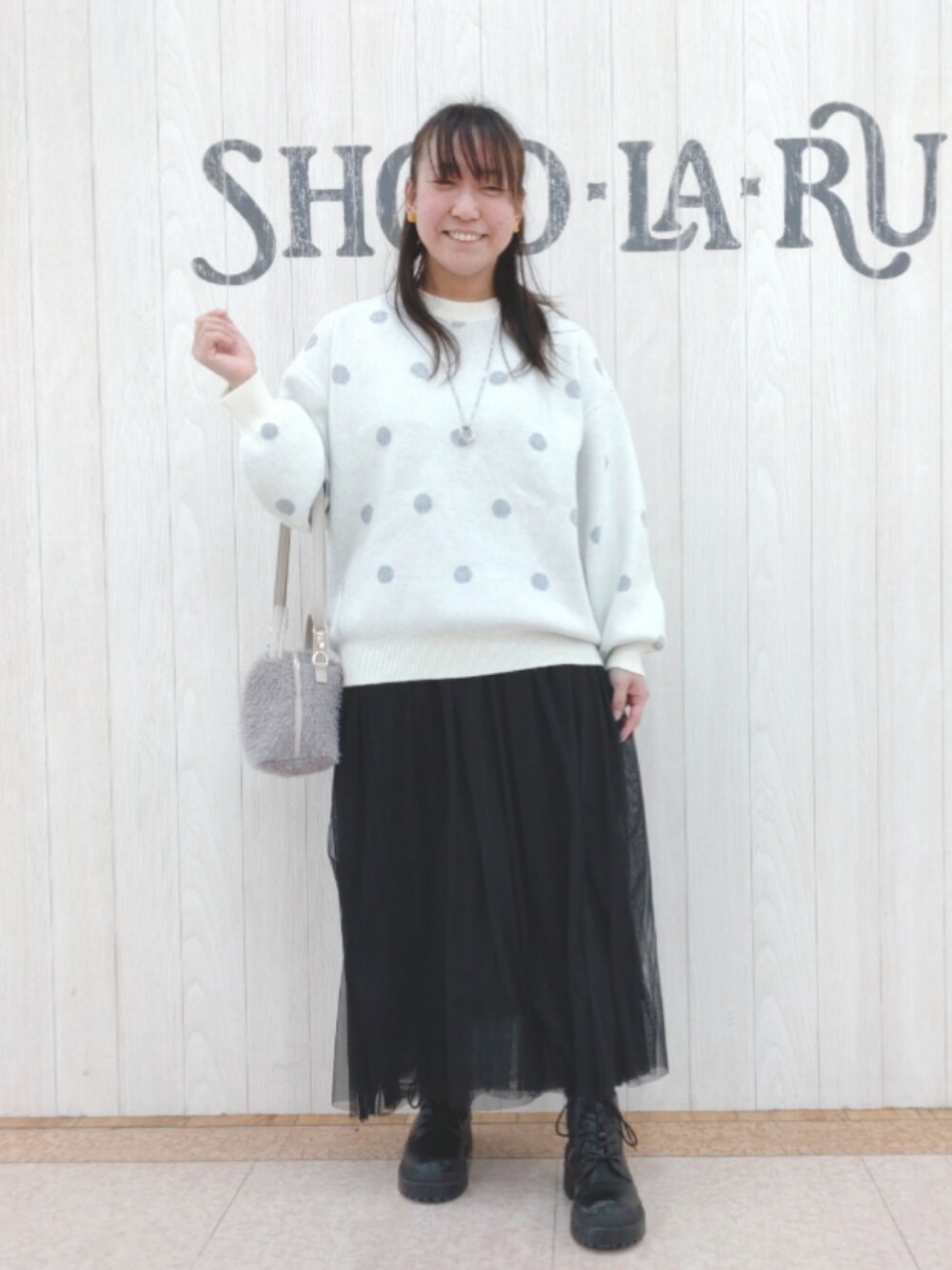 ✾ドット柄が目を引くオトナカジュアルコーデ✾ 【サイズ感】 ニットはゆったりしたシルエットのため、Mサイズでオーバーサイズ気味に着ることが出来ました♪ スカートはウエスト総ゴムでフリーサイズですが、昨年より少し小さく感じました! 【素材感・着心地】 ニットはジャガード編みのしっかりしたニット生地で、着心地も良く洗濯機で洗っていただけます♪ スカートは適度なハリのあるやわらかいチュール素材が2枚重ねになっており、程よいボリューム感が出ます♪ 【オススメポイント】 ニットは大きめのドット柄がかわいい!ゆるシルエットでお尻周りが隠れる丈なので体型カバーにもオススメですよ(*^^*) スカートはウエスト総ゴムで楽ちんなのに上品見えが叶う1枚!ジャケット等を合わせたかしこまったコーデにも、ニットやトレーナー等を合わせたデイリーカジュアルコーデにも使えるので着回しもしやすいですよ♪ 【スタイリングポイント】 ドット柄が目を引くニットに黒のチュールスカートを合わせたオトナかわいいモノトーンコーデ♪ ドット部分にラメ糸が入っているで適度な華やかさがありますよ(*^^*) ※ピアスはスタッフ私物です