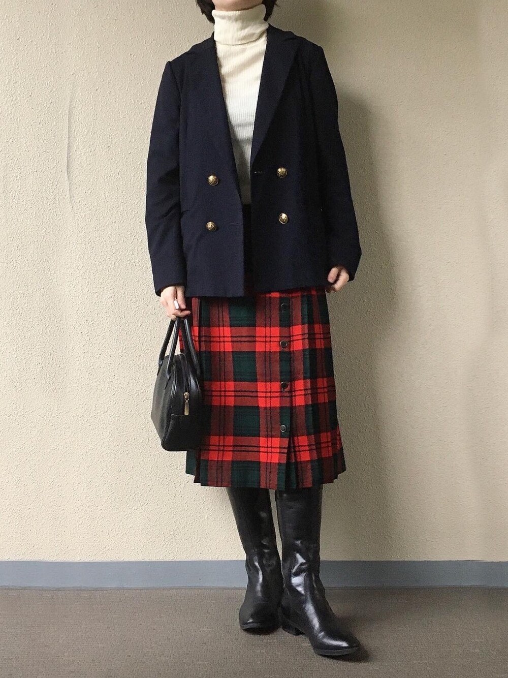 昨日のコーデです。 タートルネック解禁。 スカートの赤チェック以外は シンプルにまとめました。