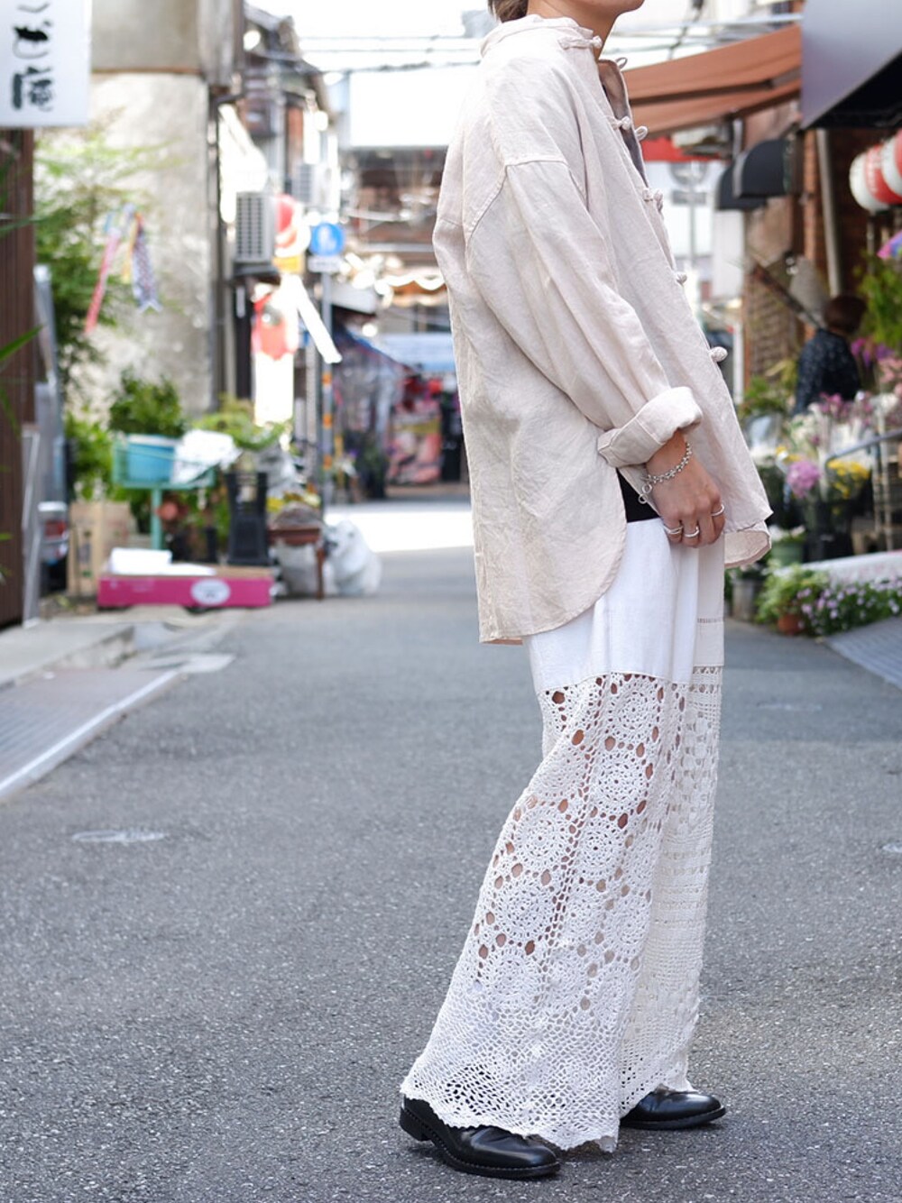 アンティークリネンと アンティークレースのコンビの レースパンツは TORTOISE オリジナルのもの。 同系色のチャイナボタンシャツと合わせて、個性的な着こなしに
