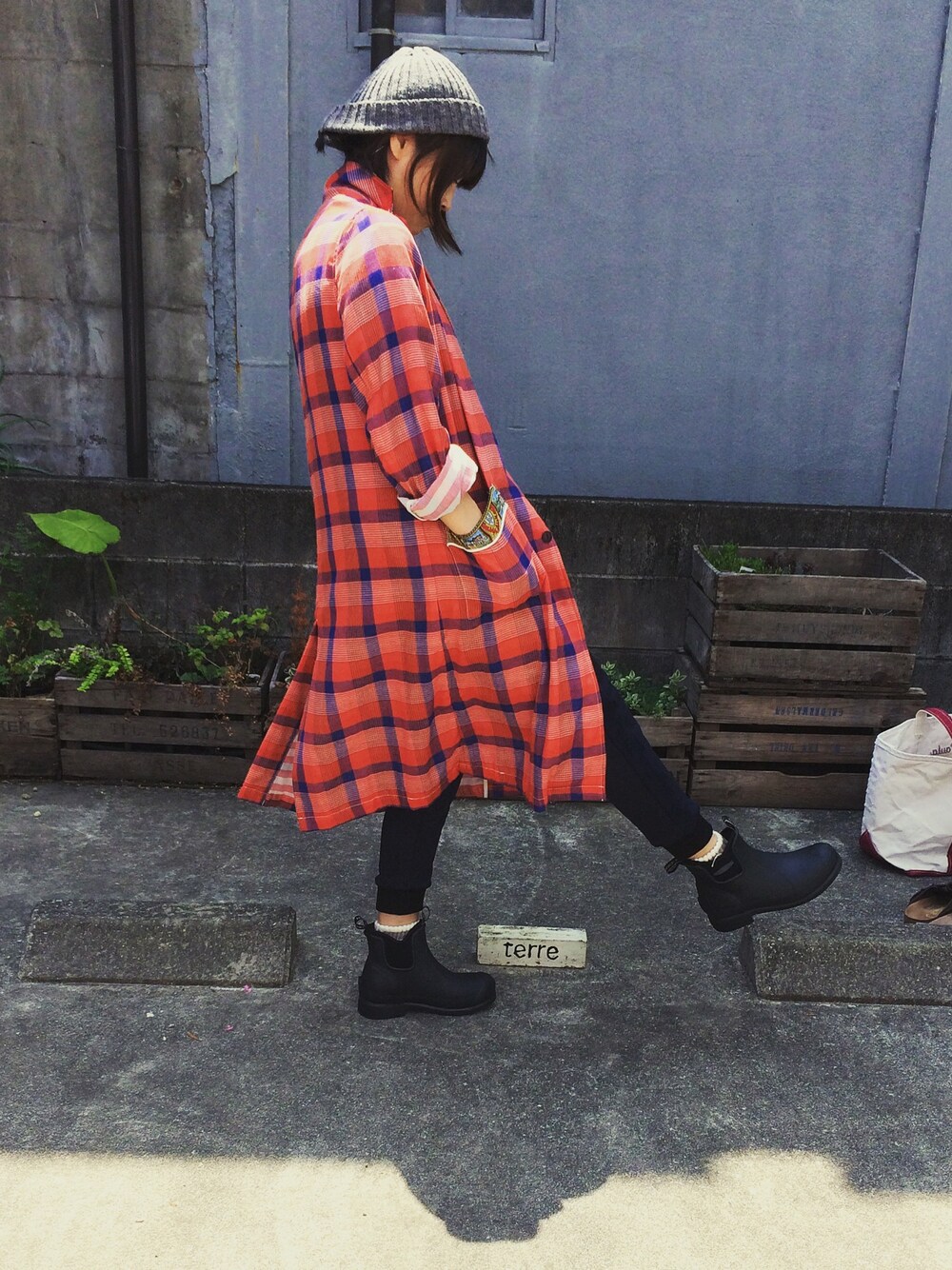 秋口には着たくなるショップコートをメインに。 足元のレインシューズはアメリカのMUKUBOOT。 丸っこいフォルムがちょっと野暮くていいんです♡