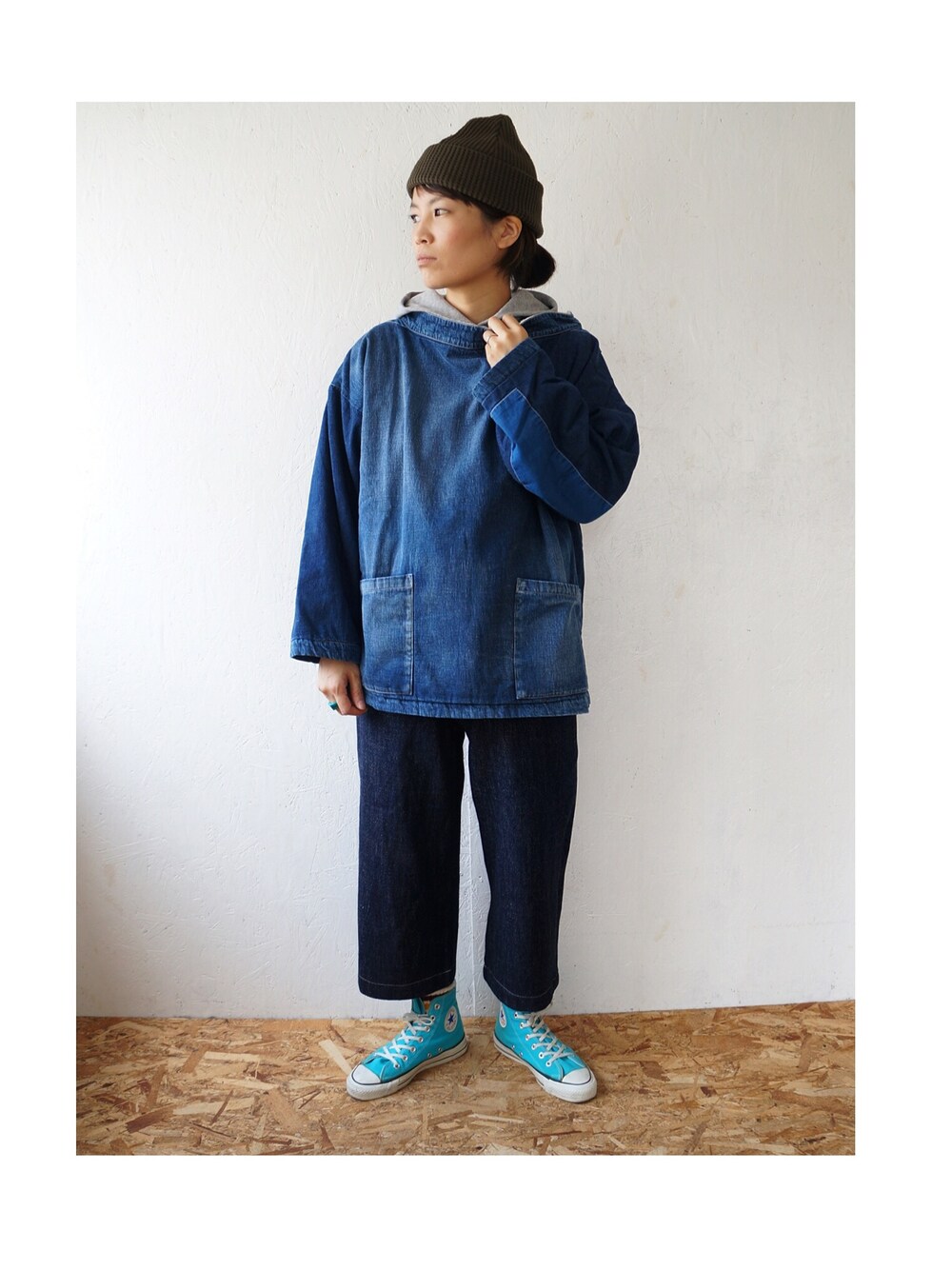 今日の撮影の1枚。 デニムオンデニム。 あったかくて、可愛いカタチのカットソーです♡