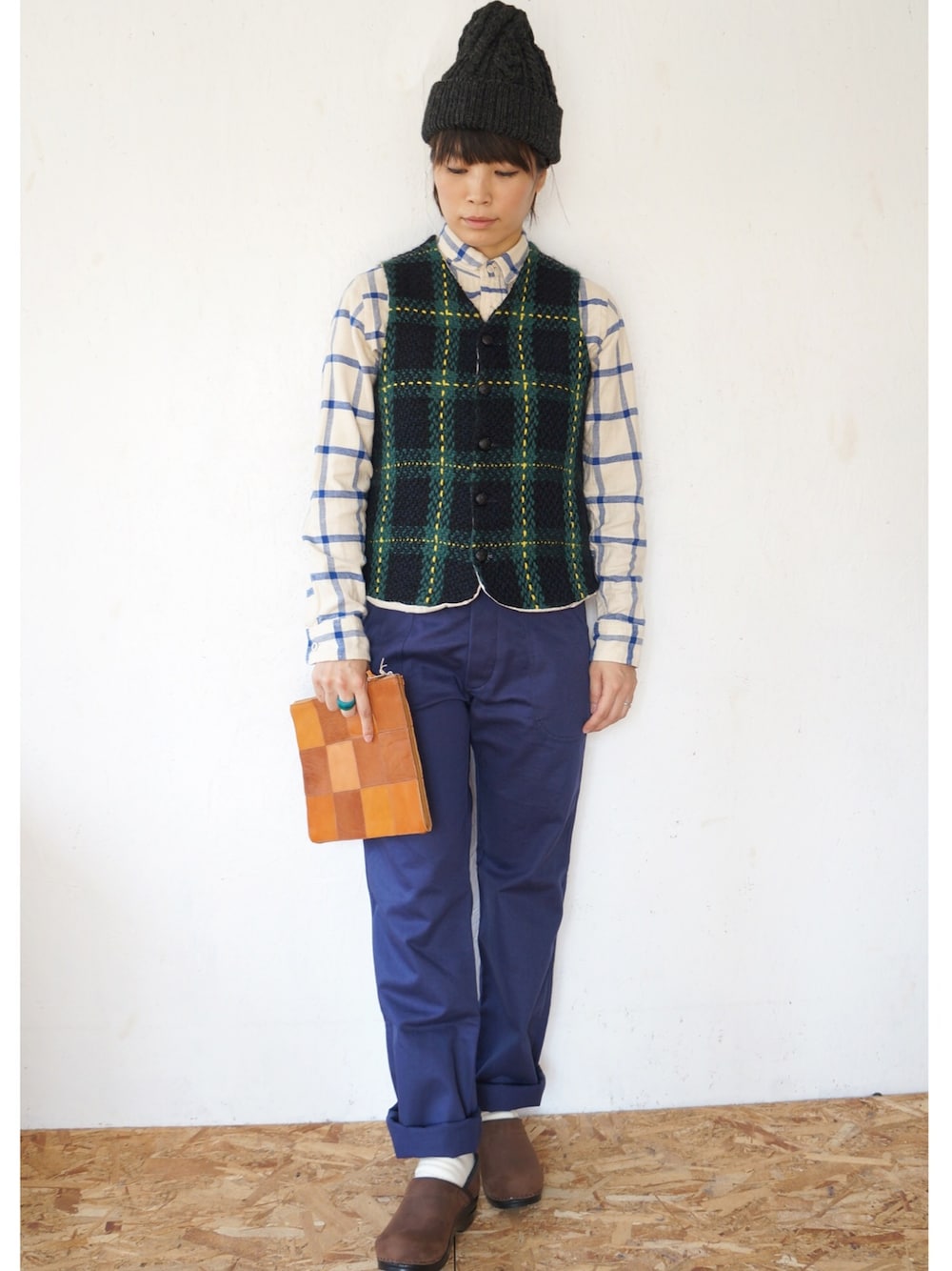 シャツとベストのチェックONチェックに挑戦。 全体の色味を合わせれば有りですね^ ^ ベストは何かと使える便利なアイテムですよね!