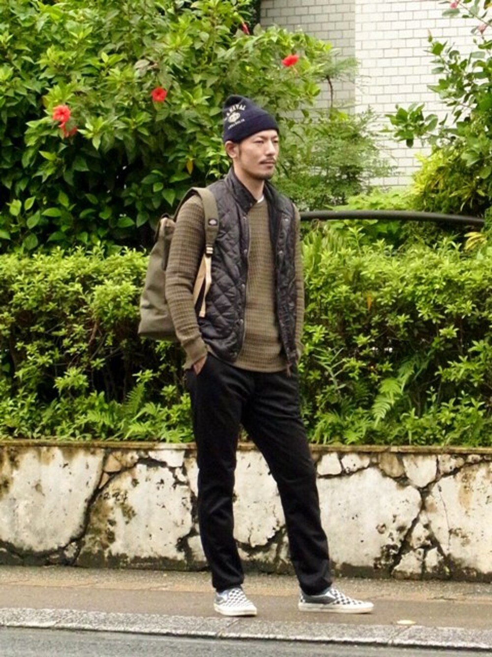 ビッグワッフル長袖Tシャツを取り入れた秋冬おすすめコーデ!! (モデル着用はカーキのLサイズ) カーキの他にブラック、オフホワイト、ネイビー、ブラック入荷しました。 チノパン、デニムとボトムを変えて着回しのきくアイテムです。
