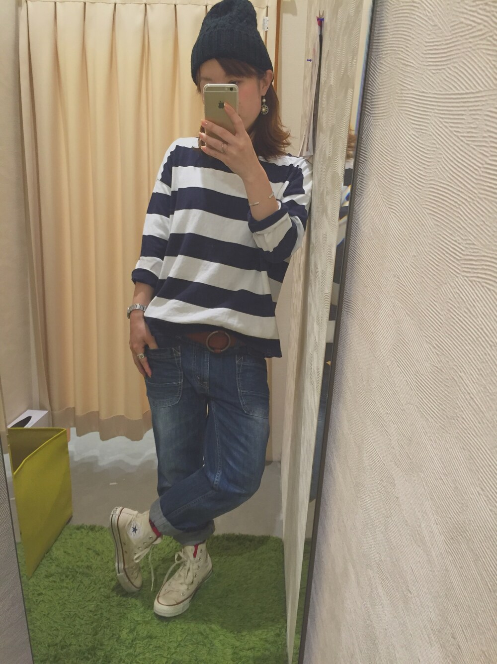 春と冬ミックス❤️昨日は足首出して寒すぎたから今日は靴下履きましたw 太めボーダーラブ(✪̼o✪̼)