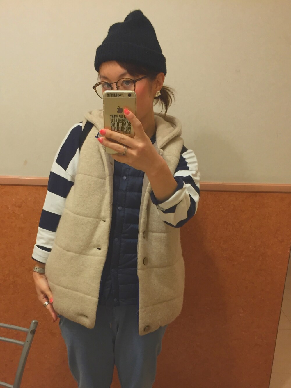 思った以上に寒くて…インナーダウンの外にまたダウンです。 デニムスゥェット楽チンで使えます。今年のヒット商品!!