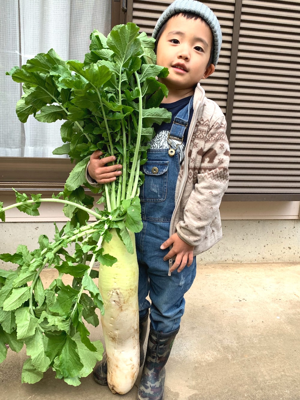 葉っぱまで入れるとちょうど息子くらいの大根。 おでんと、風呂吹き大根と、サラダと、漬物と、味噌汁と、大根おろしと…葉っぱはふりかけと、炒め物と… 余すことなく頂きました^_^