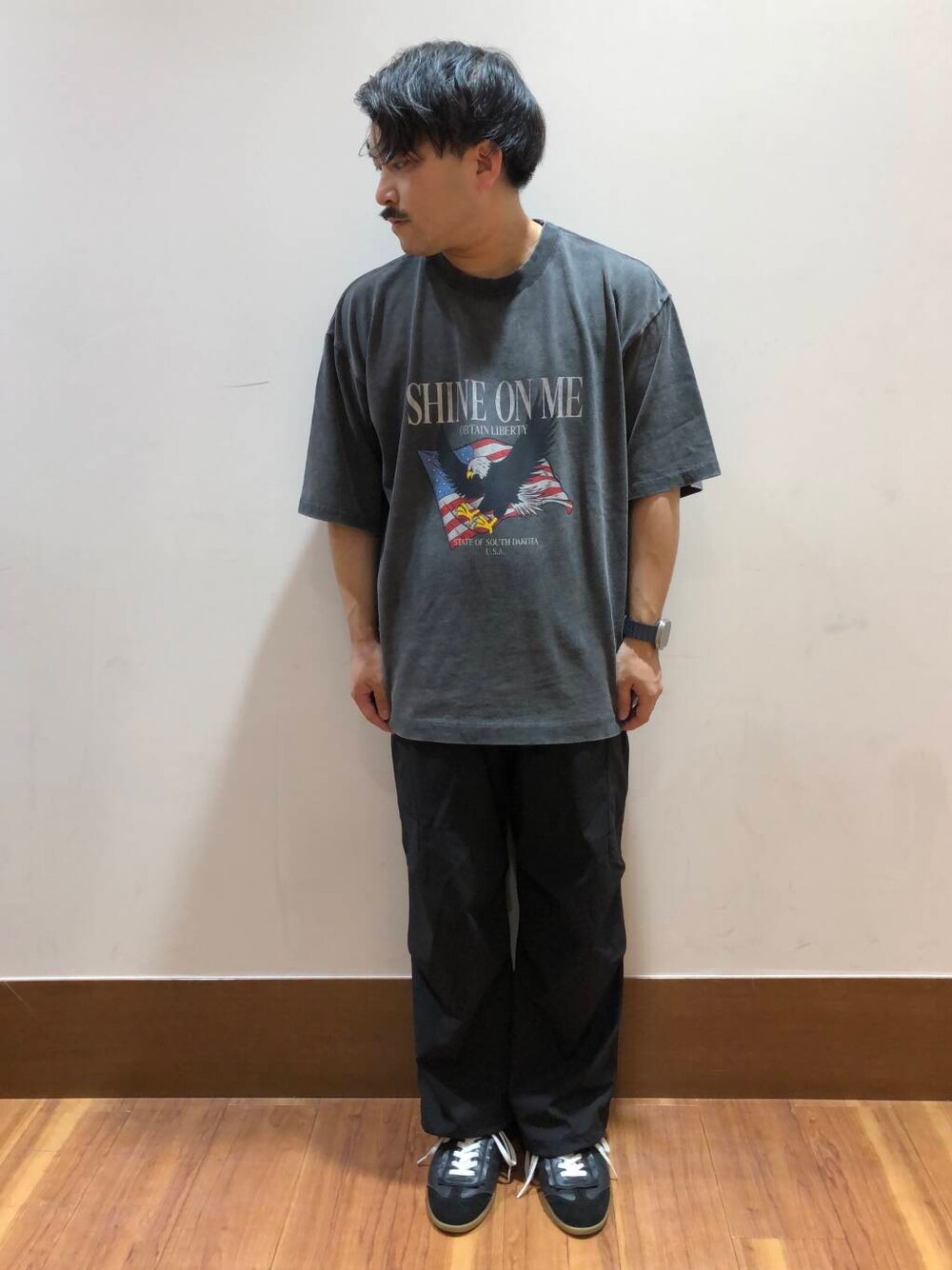 今回はプリントTを使ったカジュアルコーディネートです。 トップスはヴィンテージ感のあるフェードした色味が絶妙で、大胆なプリントで存在感抜群です。 パンツは大人気のカーゴパンツ。 夏にピッタリなサラッとした素材感に加え、裾のドローコードでシルエット調整していただけます。 参考にしていただけると幸いです。