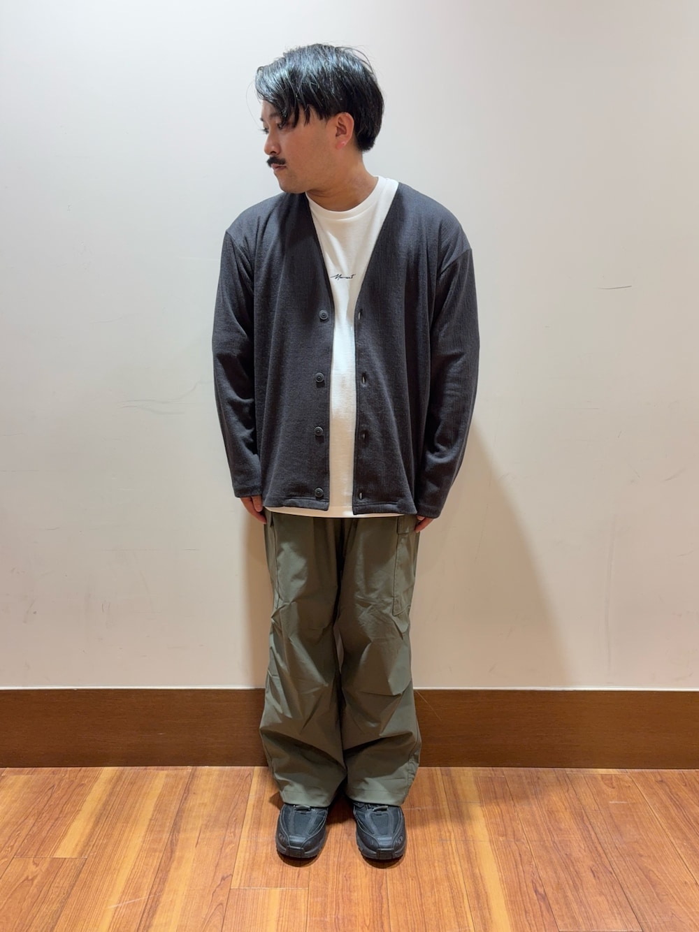 サラッとしたカーディガンにカーゴパンツで今からでも着れそうなリアルな着こなしに。 刺繍の施されたTシャツセットも嬉しいポイント。