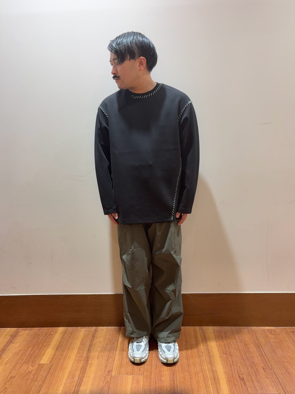 ステッチが存在感抜群のTシャツにサラッとしたカーゴパンツで軽やかなコーディネートに。