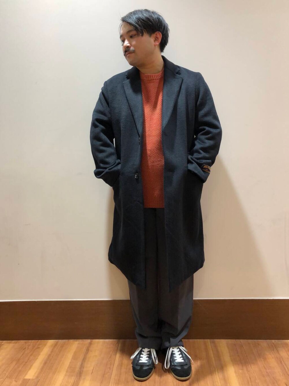 今回はチェスターコートを使ったきれいめコーディネートです。 コートは、ベーシックなサイズ感で、普段使いからビジネスシーンまで幅広く対応したお使いいただきやすいアイテムになっております。 ウール混紡のメルトン生地で保温性もバッチリです。 ニットは、ミックス糸で編まれており、柄の様な杢調の雰囲気が魅力的です。 アクリルを使用しており、程よい肉感で、ロングシーズンお召しいただけます。 パンツは、テーパードシルエットが美しく、着回し抜群。 薄い裏起毛なので、ニット同様に、ロングシーズンお召しいただけます。 参考にしていただけると幸いです。 ご覧いただきましてありがとうございます。