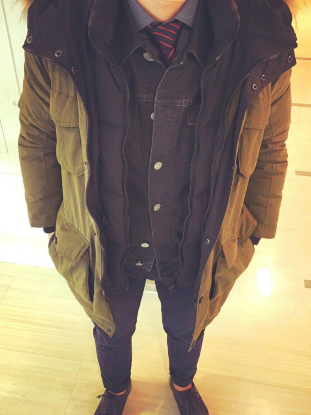 下はネイビーのスキニーパンツ👖 上は明るめのグレーがかったドレスシャツにオレンジのラインの入ったネクタイで大人チックに着こなし、これだけだと普通のサラリーマンぽいので黒のデニムジャケットをプラス👔 デニムジャケットをインナー代わりにモッズコートをプラスすれば、カジュアルな大人コーデの完成✔️