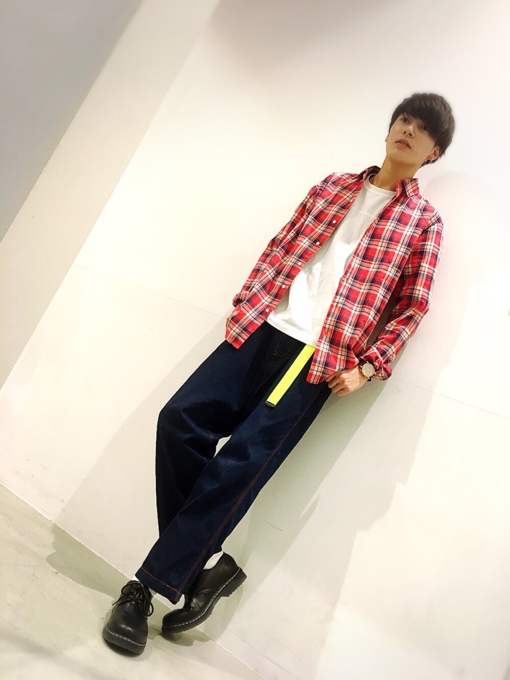 春らしくマドラスチェックシャツコーデ😄 デニムワイドパンツにイエローのベルトでアクセント✨