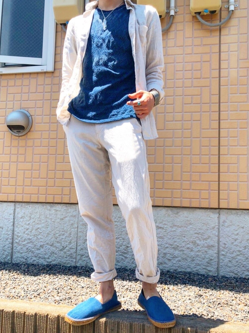 ホワイト系のその他パンツ、ホワイト系のシャツ/ブラウスを着用したメンズの夏コーディネートの1枚目の写真