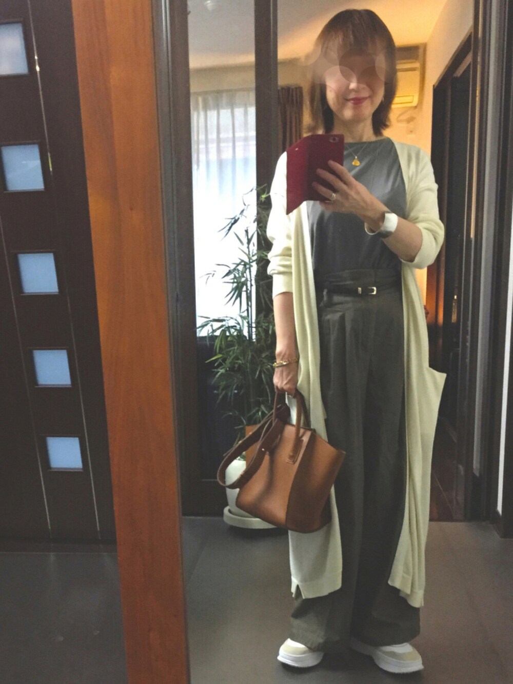 【秋コーデ】 朝晩が涼しくなったら、ロングカーディガンで温度調節をします。 オフホワイトのロングカーディガンを羽織って、カジュアルなダークグレーのTシャツとカーキ色のパンツを綺麗目に✨ かっちりしたバッグ👜を合わせて大人っぽく、足元は丸みのあるスニーカー👟で抜け感を。 ちなみにロングカーディガン以外は、先程投稿したコーデと全く同じものになります。🙇♀️ いいね、お気に入り、フォルダイン、フォローしてくださる皆様にとても感謝しています!ありがとうございます!😊🙇♀️🙇