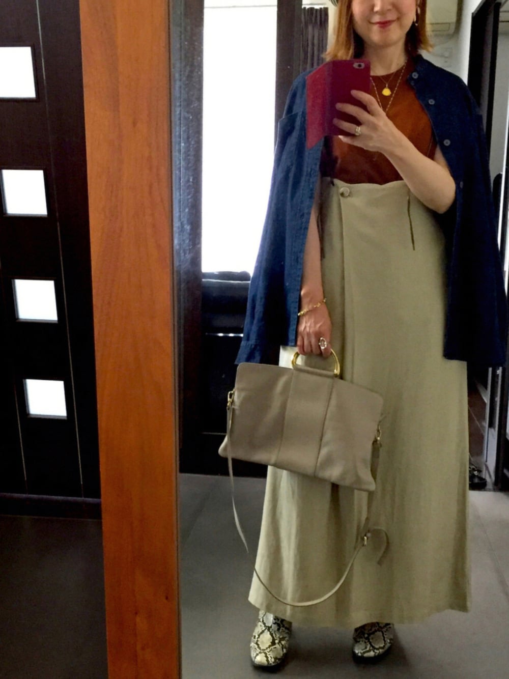 UNIQLOデニムオーバーサイズスタンドカラーシャツ(男女兼用Sサイズ)の着回しコーデです。 デニムシャツをUNIQLO×マメのノースリーブのTシャツ(ブラウン)に肩掛けしました。 ベージュ〜ブラウンのコーデにネイビーのデニムシャツでアクセントを✨ 朝夕の寒暖差がある初秋や、まだまだ暑いけど秋っぽくしたい時におススメです! 今日もお仕事頑張ります! 皆様も良い一日を!😊💕 いいね、お気に入り、フォルダイン、フォローしてくださる皆様にとても感謝しています!ありがとうございます!🙇♀️🙇♀️🙇♀️