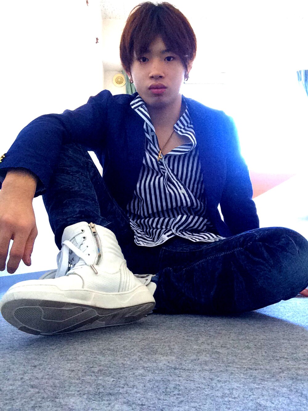 三代目のSummer Madness風の青を中心のコーデの中にファスナー付きの真っ白いハイカットスニーカーを合わせてみました!寝起きでアレですけど(笑)