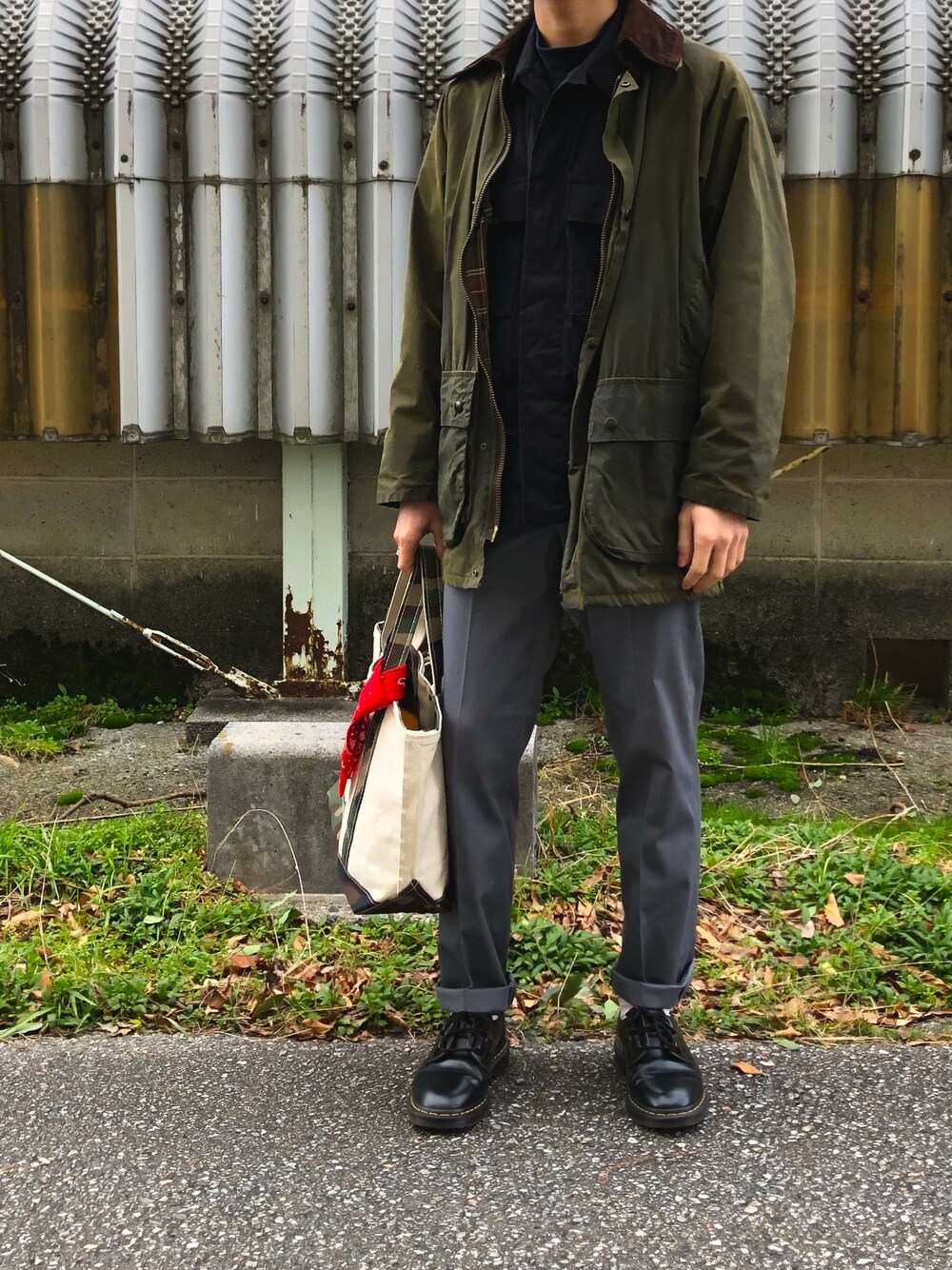 オイルドジャケット✖️スラックスでグッと大人らしいコーデになったかなと思います🙂キッチリしすぎないように新しい年代のミリタリーをいれました🤲