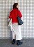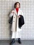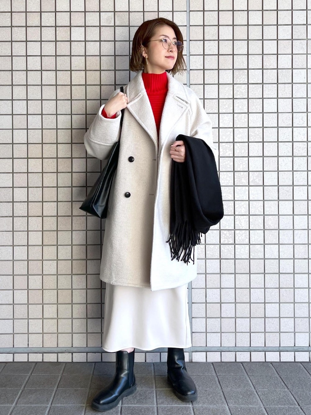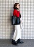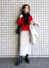 赤のリブ切替ニットを主役に、きれいめにまとめたコーディネートです☺︎ スカートとコートは、ニットの袖口と裾に入ったラインの色に合わせたのがポイントです♪ 小物は黒で統一感を。 お仕事にも、年始の集まりにもお勧めです!