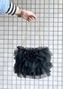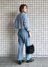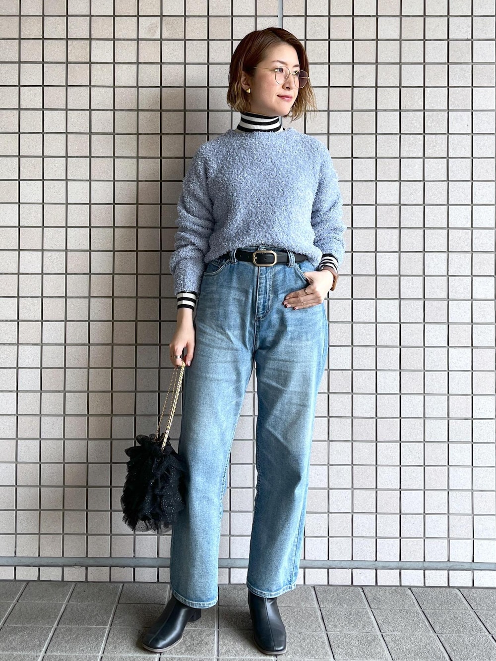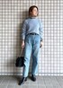 ブルーのニットとデニムを合わせた、ワントーンコーデです☺︎ とのこどころに黒を入れて、メリハリのあるコーディネートに♪ カジュアルな合わせなので、バッグをフリルバッグにしたのがポイントです!