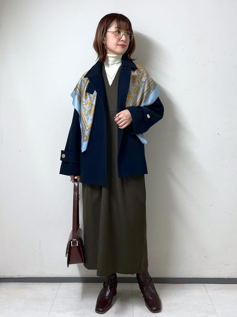 バロック柄のスカーフを主役にした、クラシカルコーデです♪ スカーフの柄を引き立てるように、他のアイテムは無地でシンプルにしました☺︎ お仕事にもお出かけにもお勧めなコーディネートです!