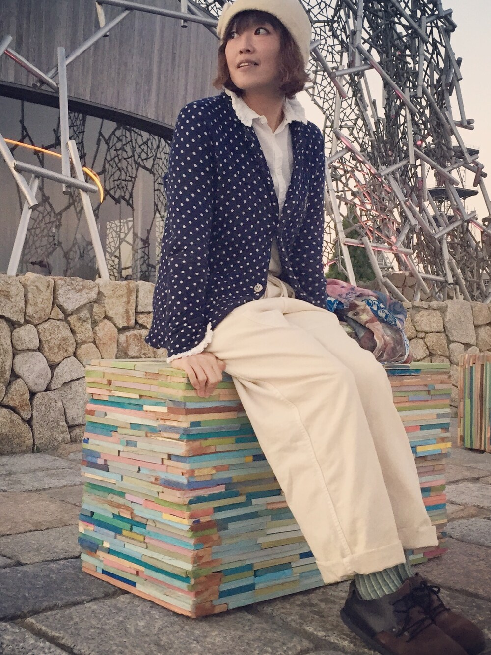 ネイビーとアイボリーのコーディネート。ネイビーのドットのジャケットがお気に入り^ ^ キャピタルコーデ!