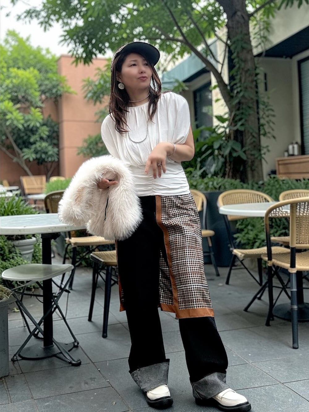 暑いのか寒いのかわからないコーデ〜 色は白と濃紺デニムと小物が茶系でまとめてます ノースリや半袖にモフモフのベストなどの 冬物合わせがおもしろくて好きですぅ✨ スカーフは無くてもよかったんですが 帽子との兼ね合いであった方が良いかなと、、、 いつも見ていただきありがとうです✨✨✨
