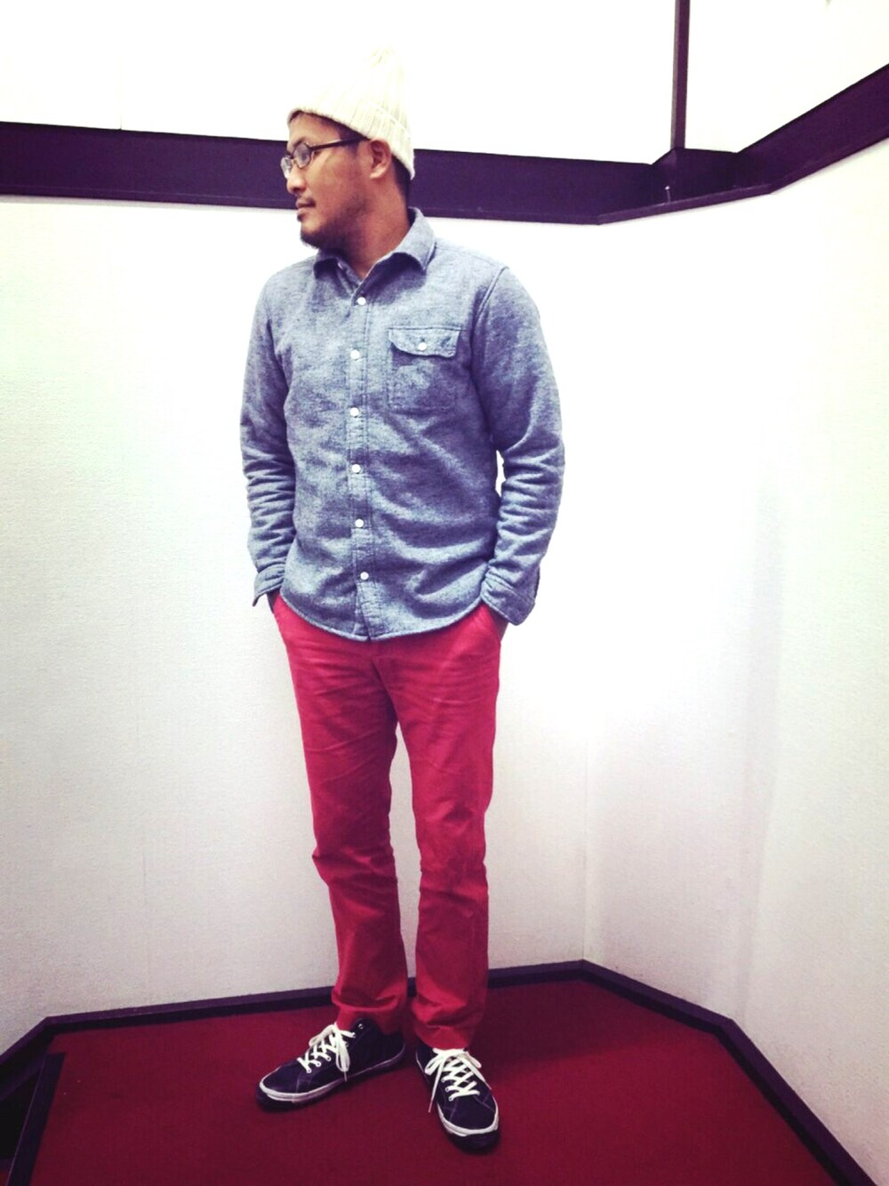★白ニット帽と赤パンツコーデ★ アラフォーだからこそ明るいパンツということで、赤いパンツのコーデを考えてみました! 赤いパンツが派手なので、トップスは明るいグレーで落ちかせて、白いニットキャップでひげ面も爽やかに見えるよにしました! あいかわらず、GUはお気に入りです^ ^