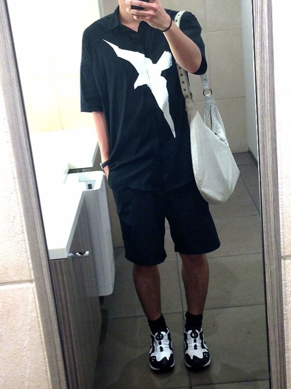 半袖ハーフパンツ x オールブラック こどもっぽくならないように気をつけました。 暑苦しく見えがちなオールブラックでも、少し白を入れると印象が変わりますね。 Pants : used