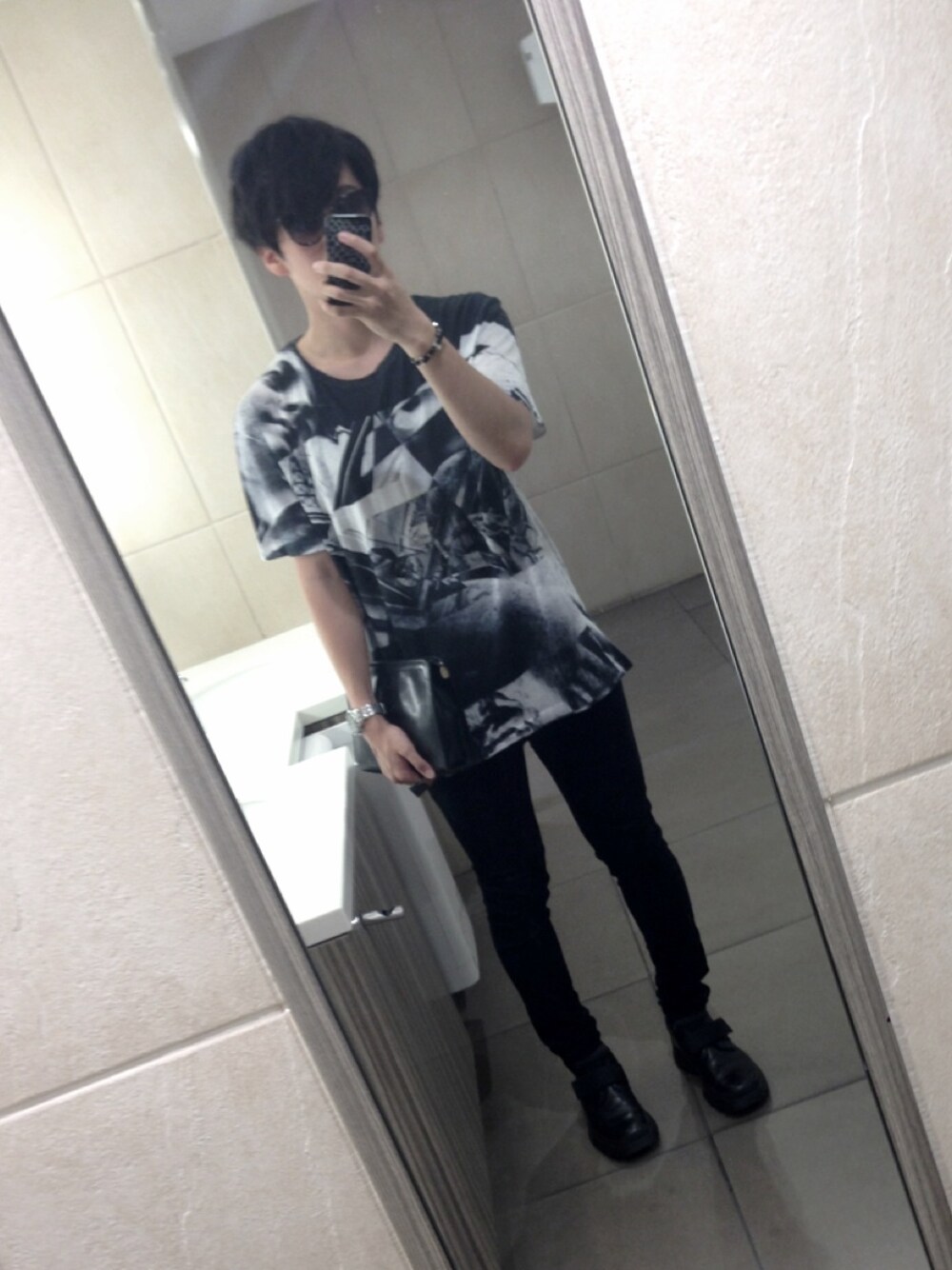 総柄T x レザースニーカー 総柄Tに黒スキニー、レザーシューズ やっぱり夏場はこのパターンが多いです。 ただ、単調になりすぎないように 革靴をデザイン性があるものにしてみたり、 トップスのサイズ感で遊んでみたり ちょっとしたポリシーがあります。笑