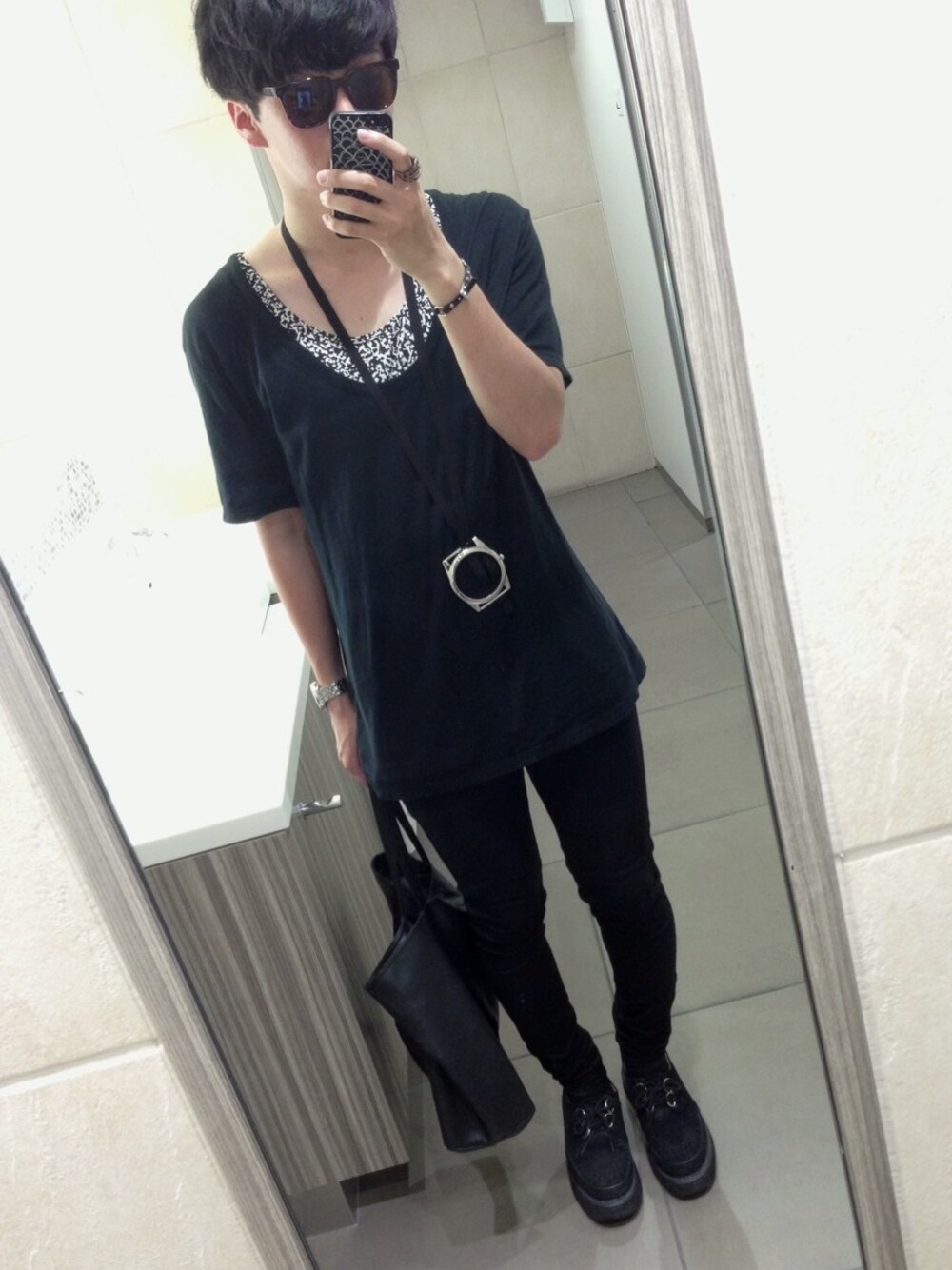 柄タンクトップ x レイヤード ワンさんのカットソーが首元ガッツリオープンすぎたので、柄タンクトップをインナーにして露出軽減しました。 スキニーが暑すぎる…そろそろ秋まで封印かな…