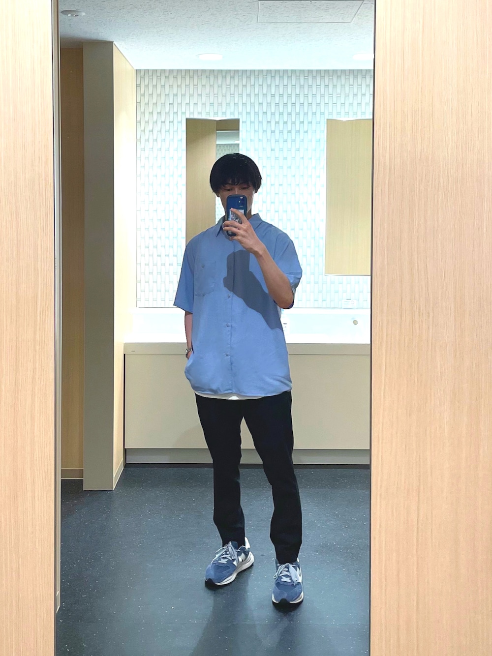GLOBAL WORK コーデ シャツとスラックスでシンプルで綺麗めなコーディネート組んでみました! 【 ポイント 】 シャツとスニーカーの色を青で合わせてあげることでコーディネートの色味に統統一感をもたせました^ ^ シャツの下にはタンクトップでレイヤードを入れることで白のカラーをワンポイントとしていれてます♩¨̮: