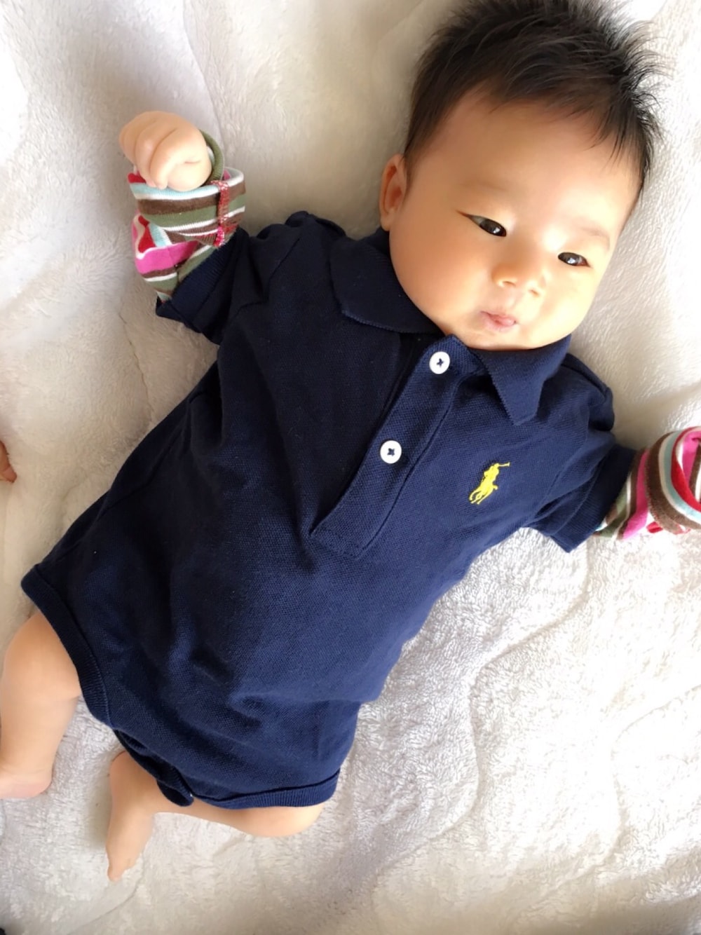 ばぁーばに買ってもらいました♡ まだ首が座らない1.5ヶ月児には襟が窮屈そう…