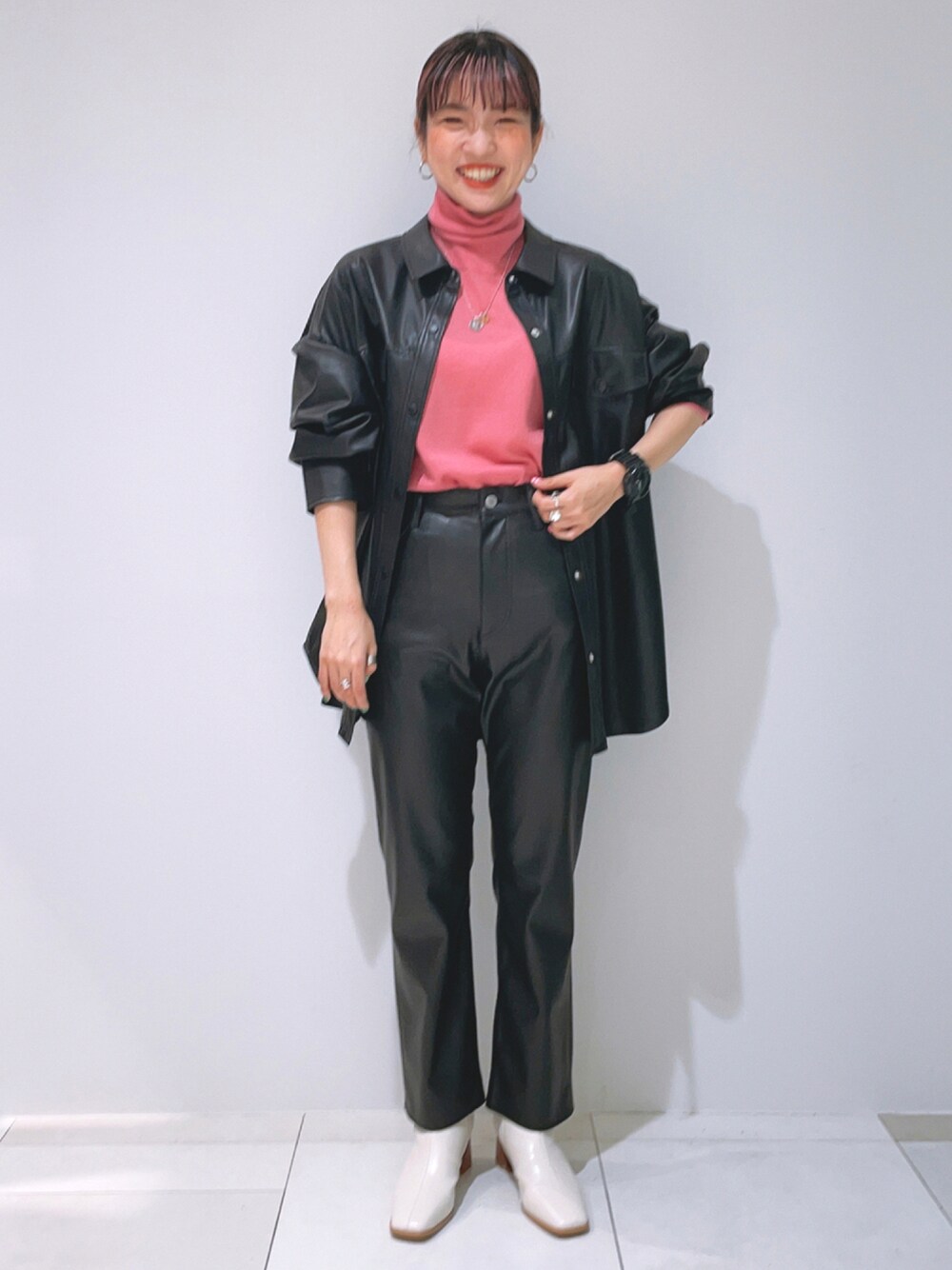 身長:155cm インナーをピンクにすることで甘さも加えたコーデに仕上げました。