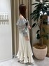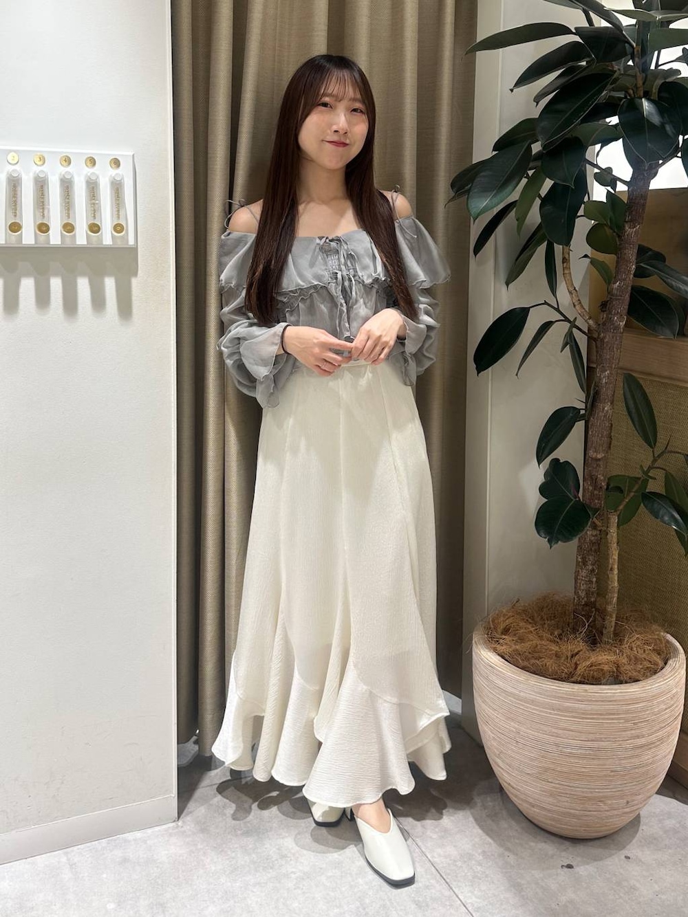 🥣各アイテムのおすすめポイント  ̄ ̄ ̄ ̄ ̄ ̄ ̄ ̄ ̄ ̄ ̄ ̄ ̄ ̄ ̄ ̄ ̄ 【トップス】 シアー素材×フリルが可愛いブラウス♡ キャミとセットになっていて、1枚で華やかに着られるのが嬉しい! ショート丈なのでスタイルアップも◎ デニムやカーブパンツでカジュアルに着るのが最近の気分🩰 ブルーグレーみたいなお色味でブルベさん大優勝カラー♡ ちなみに、グレーすぎないのでイエベ春の私も可愛く着られました♡ 前リボンなので紐の調節でオフショルぽく着るのも 可愛いかったです🎶 【ボトムス】 微光沢で品のある生地を使用♡ 裾のデザインが可愛いスカート🪡 ランダムに縫われているので歩く度に 揺れ感がとても可愛いです! マーメイドシルエットですが、裾に生地が たっぷり使われているのでフレアぽい デザインで着ていただけます! オールシーズン着用可能です♡